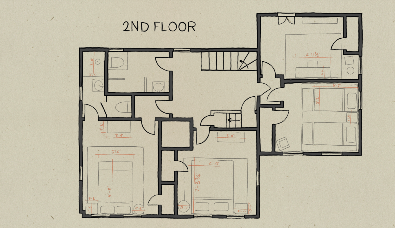 The addition includes two upstairs bedrooms. They are both playful nods to bygone periods with a trundle in the “blue room” decorated with a geometric rug and gingham red check bedding against the blue wallpaper, while the “twin room” enhanced the existing wallpaper with vintage trunks and spreads. A primitive candle holder serves as the side table and tucked in the corner is a charming three-legged chair. The full guest bath upstairs was completely gutted yet still references historical characters in a modern setting. The upstairs hallway is refreshed with a whimsical wallpaper and the stair runner is the same as the kitchen rug in order to carry the palette throughout the house.